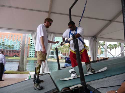 There comes a time when you realize that terrible things happen and they can happen to the best of people. Loss of arms, legs, or the full function of the mind. Or losing the feeling and muscle control from the waist down - or even worse - from the neck down. These are some of the situations our disabled veterans find themselves in. Recently injured from duties in Afghanistan, Iraq and other places in our world where conflicts exist they come to gather at a conference that honors them. In December 2008 they were honored at the “Salute Our American Heroes, Road to Recovery” conference in Orlando, Florida at the Disney World Resort. I was privileged to be part of Mark Wellman’s Adventure Sports Expo where we worked with the veterans at the conference to introduce them to outdoor sports such as skiing, snowboarding, rock climbing and bicycling. Most of them, I learned had enjoyed such sports prior to their injuries. Now they had no idea if they would ever perform them again. With the use of modified equipment(s), refined specific techniques, the aid of experienced instructors and the Endless Slope they learned to overcome their doubts. They experienced skiing and snow-boarding in Orlando Florida at the Walt Disney grounds between the Swan and Dolphin hotels on the Endless Slope as well as scaling a rock face on a climbing wall and maneuvering through an bicycle obstacle course pedaling a futuristic looking Tri-bike powered by a hand pedal and steered by their chest. By accomplishing a sport they thought was now beyond their reach they discovered a renewed hope for success. With life made difficult by their injuries, finding their ability to perform once again in sports they loved to do before their unfortunate circumstance gave them hope and the desire to accomplish what ever came before them. It restarted the cascade to succeed in other aspects of their life, broadening their capabilities to take on other opportunities and challenges. Providing the veterans to acheive at physically and skillfully demanding activities at the conference provided the veterans with the confidence, motivation and attitude to further go past and beyond barriers that life sets before them. By assisting the veterans to practice appropriate techniques specific for their condition with adaptive equipment(s) allowed them to perform the sport. They quickly discovered that they may even have a chance to compete in the Special Olympic events. They discovered that they were not limited by their disabilities, but by their desire to train and work to master their technique, strategies and knowledge of the sport. So with the aid of innovative equipment's, appropriate skill developments, proper training specific relative to their situation and their desire for accomplishing the sport they found the possibilities to reach endless heights. With skiing and snow-boarding, we first showed them how they could achieve the ride. They were then properly fitted with boots, if required, and the board or skis, or sitting bi-skis. Then they were harnessed either into a sitting bi-ski for the paraplegics or in a standing body harness for those who have enough motor skills to walk. The harnessing provided them with safety and security resulting in limited falling. Because the surface of the Endless Slope moved under the skier or boarder, harnessing the rider was possible as they remained skiing or boarding pretty much in a transverse line riding back and forth. As a note, just because the rider rode and turned back and forth along a lateral line it doesn’t mean that they did not feel the pull of gravity down a slope. The rider is pulled down toward the bottom of the moving slope but is able to maintain the lateral riding across the slope maintained at a specific height on the slope by edge to edge carving of the ski or snowboard just like on a snow covered mountain slope. So in essence from a physics stand point they were actually skiing and snowboarding. The advantage of the Endless Slope as a training tool is that it allowed us to provide the rider with training aids that gradually allowed for greater independence as they developed appropriate skills to handle more demanding riding. Such aids as harnessing the rider or a training bar for added stability so they could develop the proper skills and technique to eventually ride hands free. It also allowed the instructors to easily aid the rider by being easily and conveniently in front of them or behind them at all times. The instructor in front could stand in front helping point out or guide the rider and the instructor behind typically skied behind on the Endless Slope along with the rider assisting when necessary from the back. The Endless Slope advantage for the rider is they were actually skiing or boarding, experiencing the same sensations, thrills and excitement as on the mountain. Once they were shown how to control the ride we allowed them to go solo with us being right there to assist them if they had any trouble. Using specialized equipment to optimize their ride, they discovered the enhanced possibilities to maneuver on skis and snowboard. The outcome was the ability to soar once again on skis and snowboards - feeling the stable balance, speed and turning. They became an athlete in control of their destiny. On the Endless Slope they not only experienced the ride but received instant feedback of their development to control the skis or board or bi-ski. They became confident in themselves discovering that endeavors in sports are not beyond their reach. For many of us who are able-bodied, such sports as skiing and snowboarding can be daunting, but for the recently disabled veterans these activities may seem impossible. They feel excluded from participating from such sports - both physically and mentally. They have an acute sensitivity to limitations, making things seem impossible with the disappointing fear of failing. Such thoughts of failure becomes a disgusting dark clou